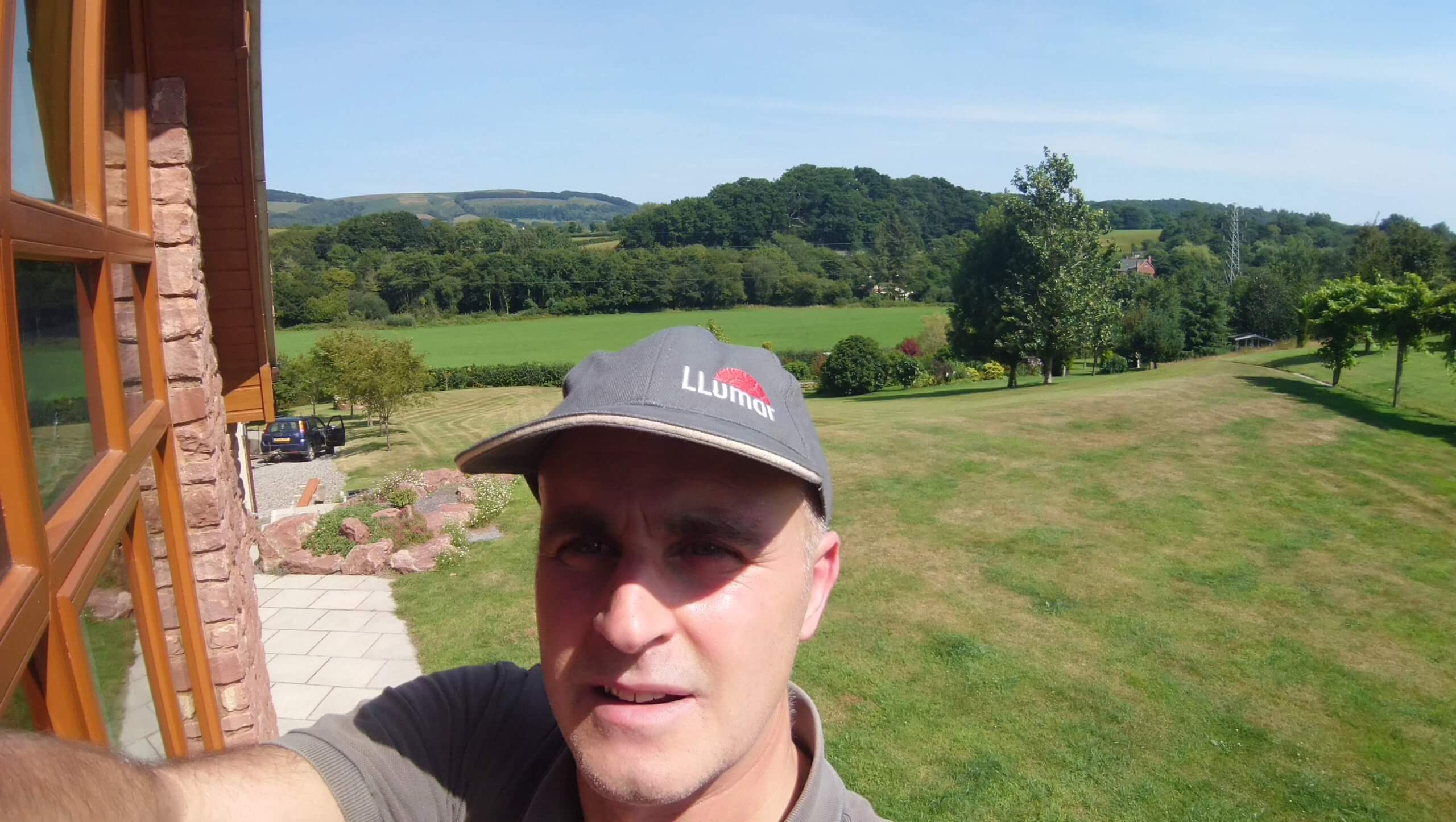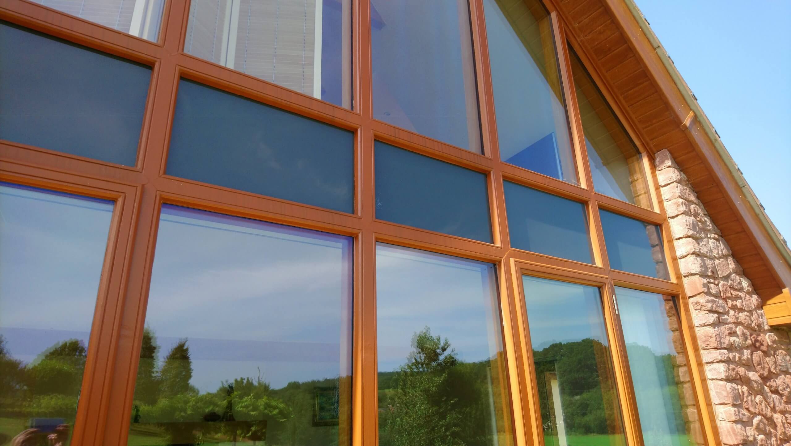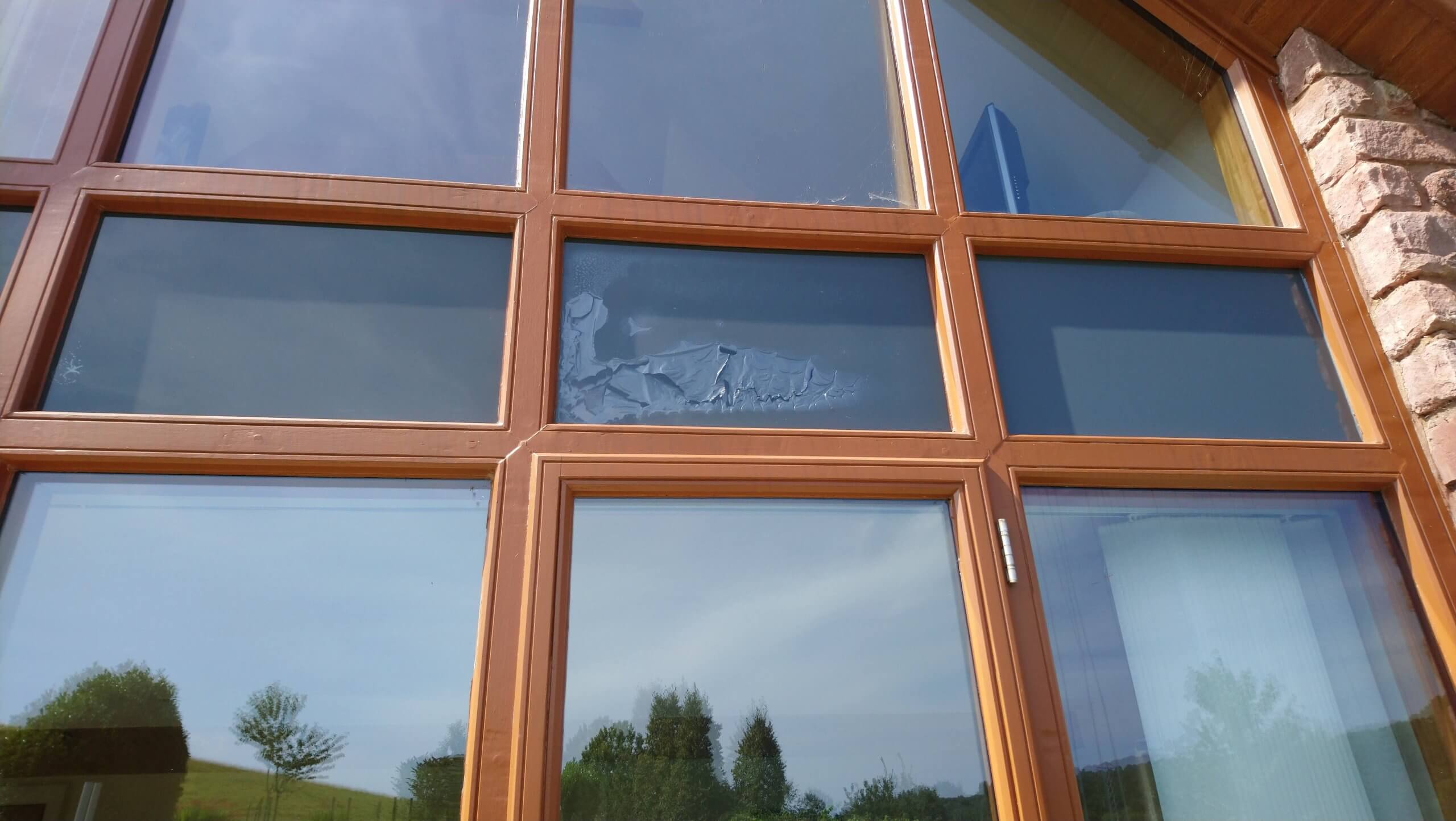 Nice view from where I was stood! But here was a problem that could only be remedied one way. The darkened glazing between up and downstairs is a void, blocked off and unreachable without either, taking up the floor upstairs or the roof down, downstairs. The void glass had film applied to hide the cavity when it was built and had over time deteriorated, leaving an unsightly mess. We assisted the cheapest and only way possible by applying a colour matching vinyl on the outside of the glass to tidy it all up.